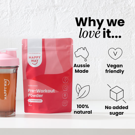 At Happy Way, our pre-workout powders are vegan-friendly and gluten-free. They’re available in 4 delicious flavours, Watermelon, Mango, Passionfruit and Strawberry Kiwi.