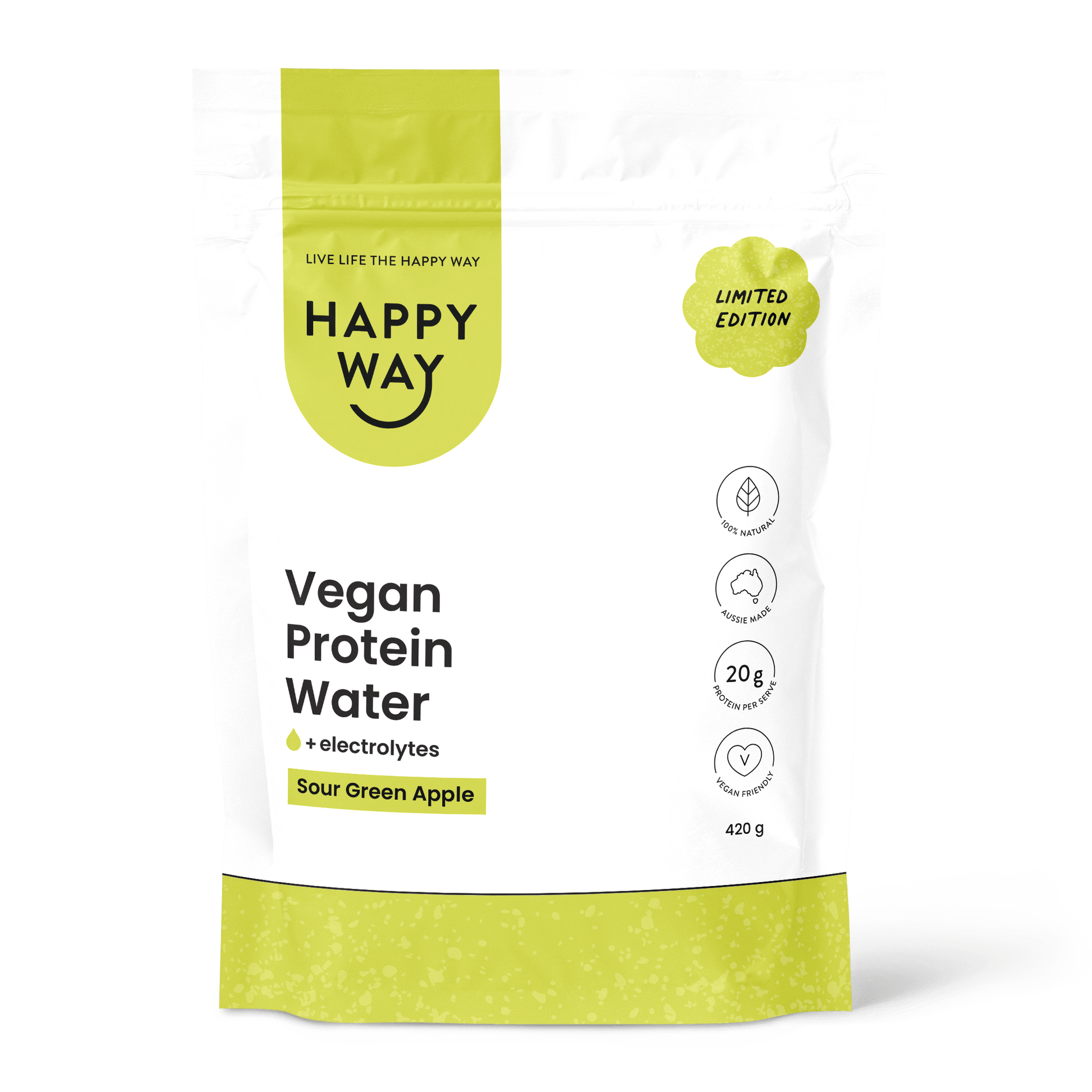 - 2 scoops Happy Way Sour Apple Vegan Protein Water