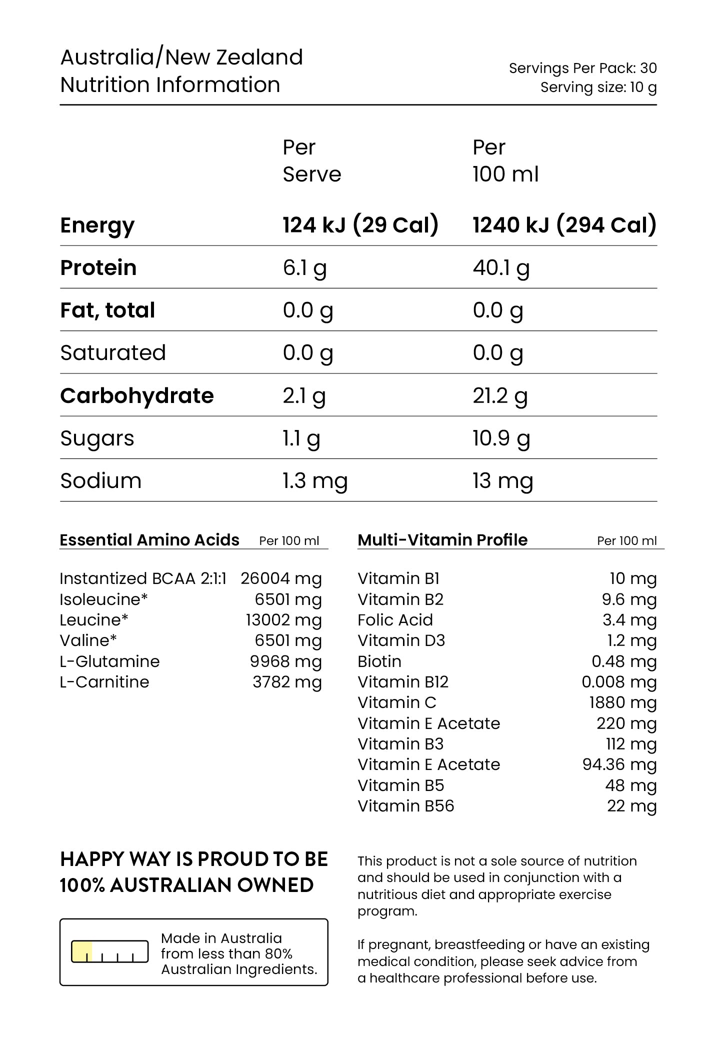 Amino Acid Blend (BCAA: 2:1:1 [Leucine, Isoleucine, Valine], L-Glutamine, L-Carnitine), Inulin, Natural Flavour, Multi-Vitamin (Vitamin C, Niacin, Vitamin E Acetate, D-Biotin, Vitamin B2, Vitamin B6, Calcium D-Pantothenate, Vitamin B1 HCL, Vitamin A Acetate, Folic Acid, Vitamin K, Vitamin D, Vitamin B12), Citric Acid, Electrolyte Blend (Calcium Phosphate, Magnesium Phosphate, Ferric Pyrophosphate, Zinc Sulfate, Manganese Sulfate, Copper Gluconate, Potassium Iodide, Sodium Molybdate, Chromium Chloride, Sodium Selenite), Green Tea Extract, Sweetener (Steviol Glycosides), Beetroot Extract, Monascus Purpureus. GLUTEN-FREE. VEGAN-FRIENDLY.