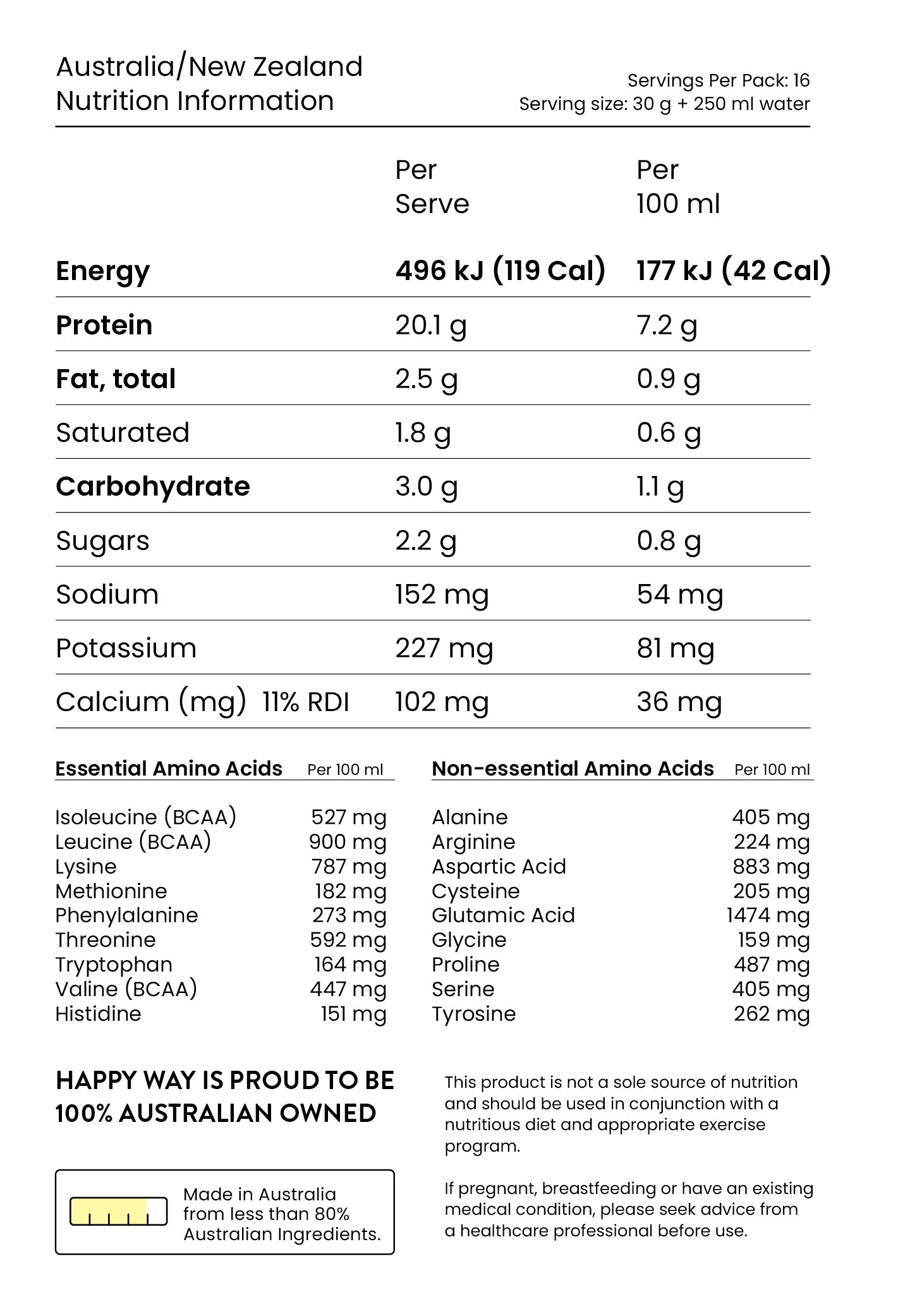 Pasture-Fed Whey Protein Concentrate, Organic Cacao, Organic Cocoa Powder, Skim Milk Powder, Natural Flavour, Organic Coconut Flour, Organic Chia Seeds, Organic Psyllium Husk, Organic Maca Powder, Himalayan Rock Salt, Sweeteners (Steviol Glycosides, Thaumatin). GLUTEN-FREE.
