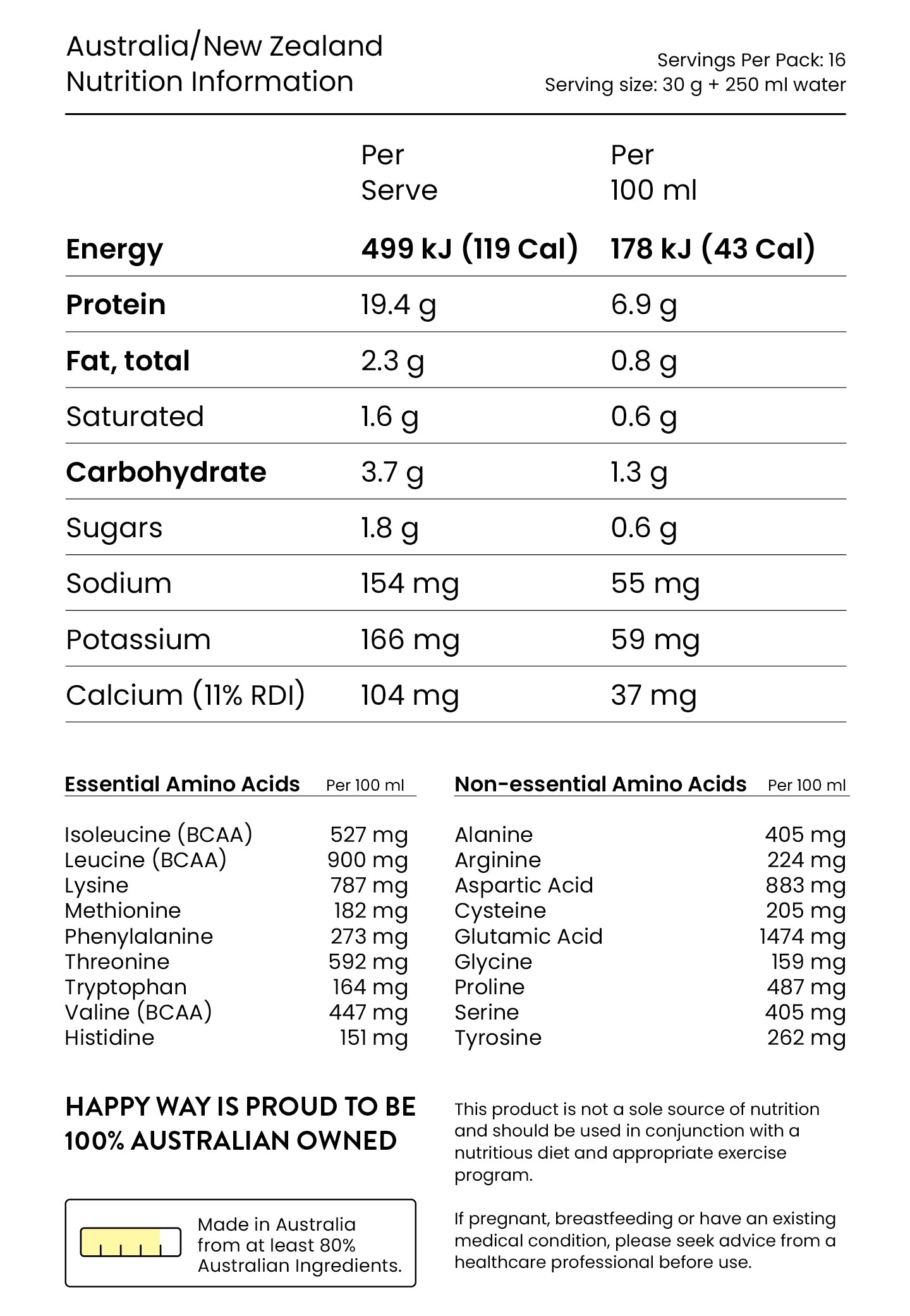 Combine two heaped tablespoons (30 g) with water or your milk of choice, mixing well in a shaker or blender to create a delicious shake or smoothie. Alternatively, add 30 grams to your morning oats, natural yoghurt or baked goodies. For optimal results, enjoy twice a day.