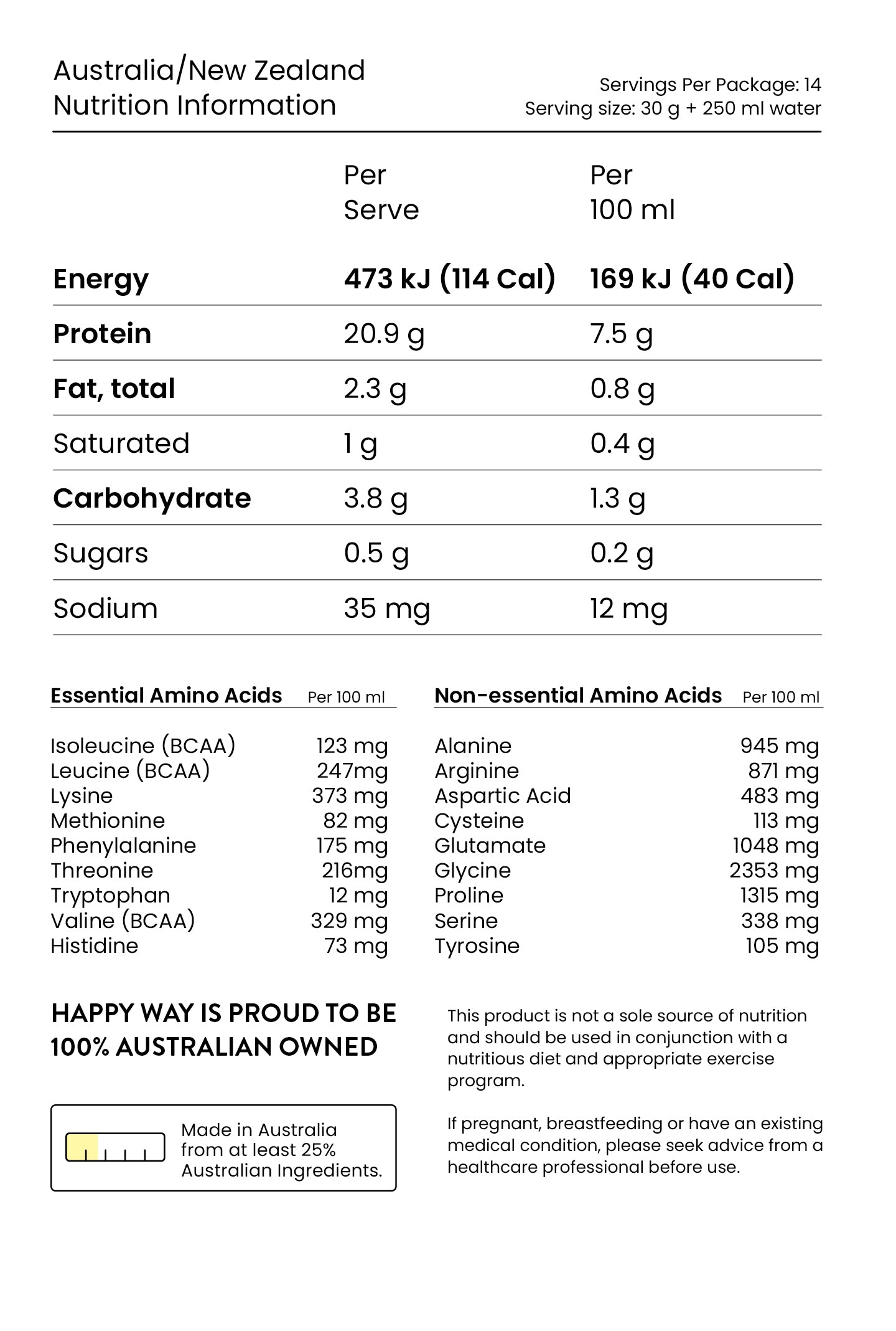 Protein Water Blend [78% Hydrolysed Bovine Collagen, Whey Protein Concentrate (milk)], Chicory Root Fibre, Natural Flavours, Coconut Water Powder, GO MCT (Medium Chain Triglycerides), Electrolyte Blend 1.8% [Potassium Citrate, Magnesium Citrate, Sodium Chloride, Calcium Citrate], Vitamin C, Food Acids (Citric Acid), Sweetener (Stevia & Thaumatin), Riboflavin. CONTAINS: Milk.