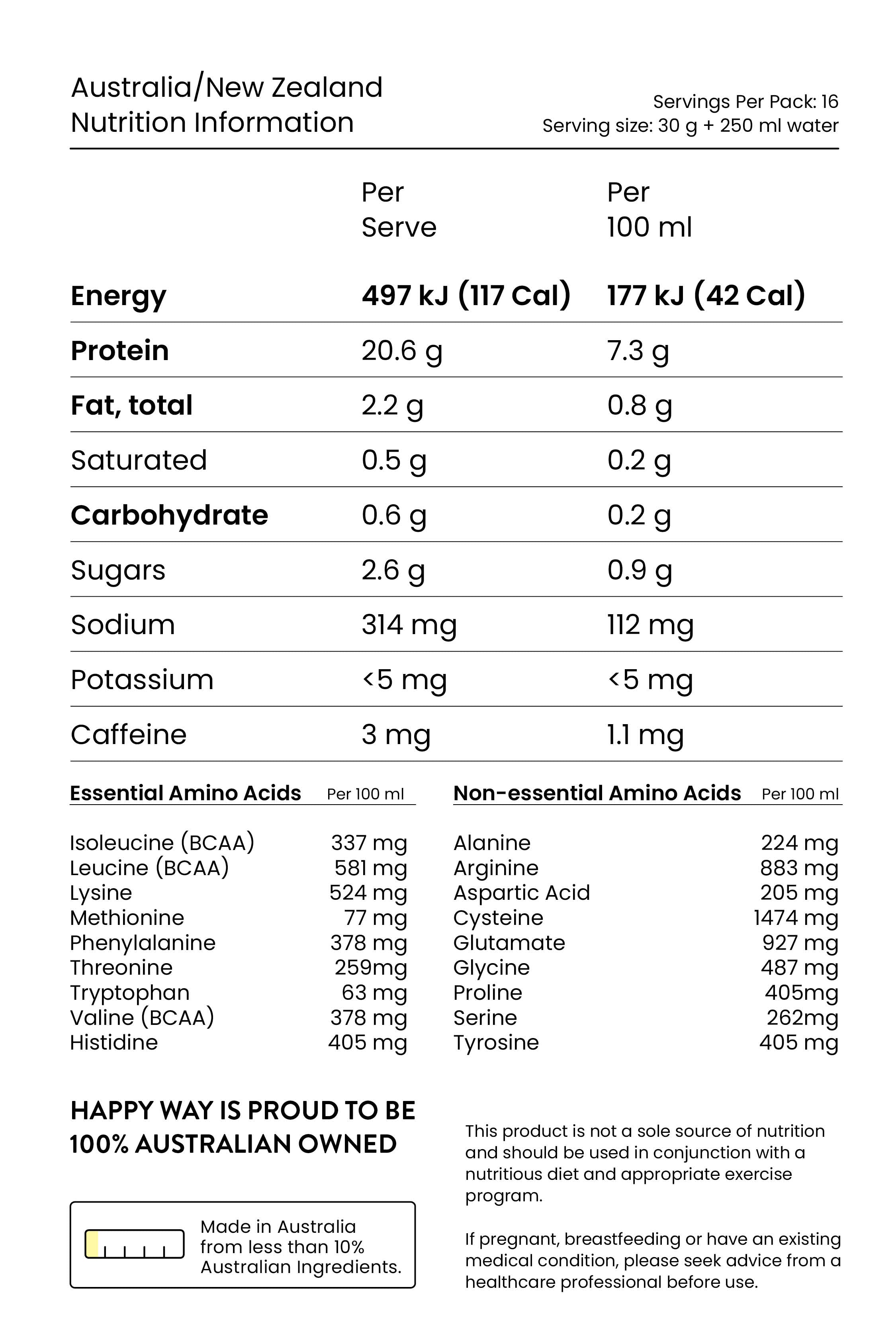 Combine two heaped tablespoons (30 g) with water or your milk of choice, mixing well in a shaker or blender to create a delicious shake or smoothie. Alternatively, add 30 grams to your morning oats, natural yoghurt or baked goodies. For optimal results, enjoy twice a day.