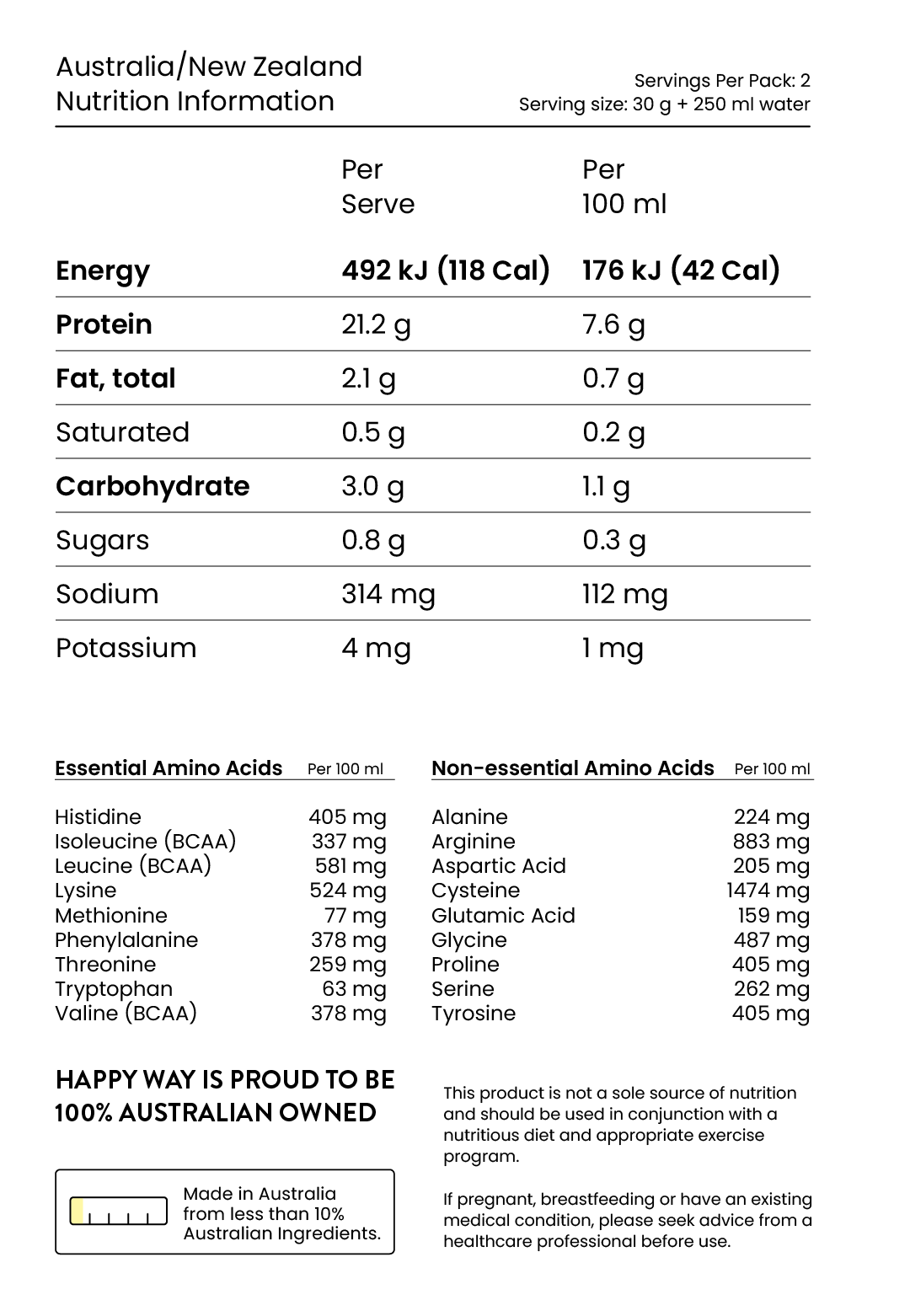 Combine two heaped tablespoons (30g) with water or your milk of choice, mixing well in a shaker or blender to create a delicious shake or smoothie. Alternatively, add 30 grams to your morning oats, natural yoghurt or baked goodies. For optimal results, enjoy twice a day.