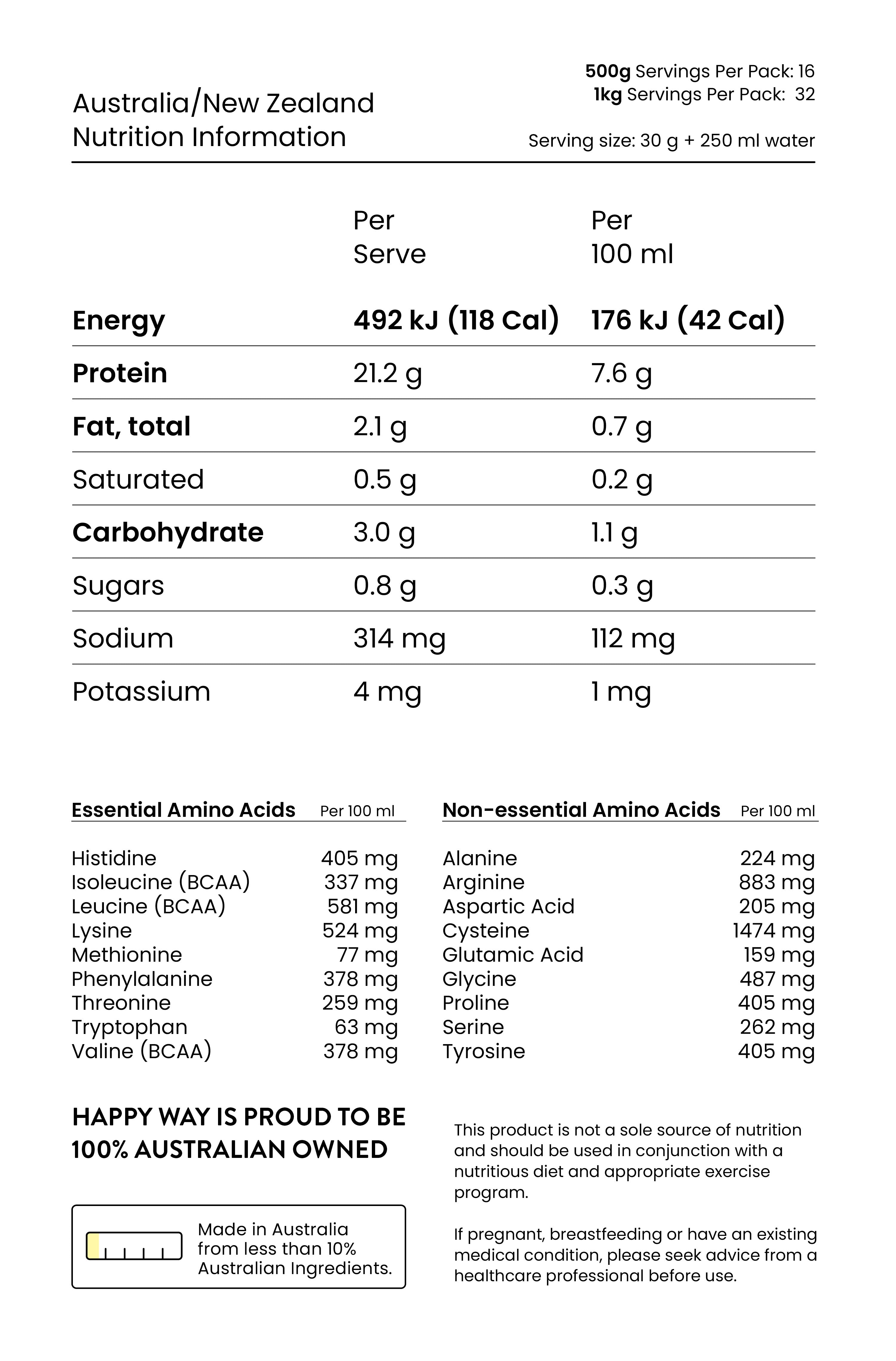 Combine two heaped tablespoons (30 g) with water or your milk of choice, mixing well in a shaker or blender to create a delicious shake or smoothie. Alternatively, add 30 grams to your morning oats, natural yoghurt or baked goodies. For optimal results, enjoy twice a day.