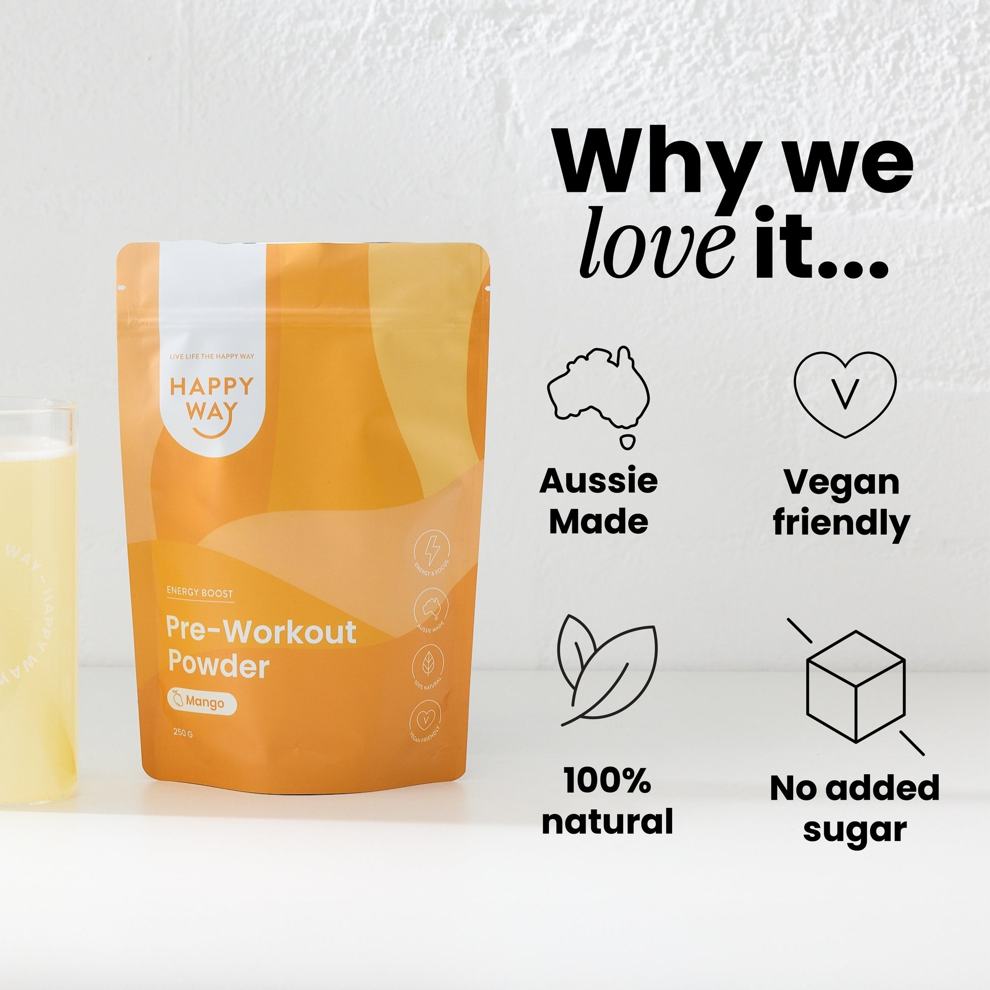 The caffeine content of our Pre-Workout Powder is: 200mg per 10 g serve (this is under the recommended maximum caffeine serving of 400mg per day for fit and healthy individuals). This product is not a sole source of nutrition and should be used in conjunction with a nutritious diet and appropriate exercise program. Not suitable for children under the age of 15. If pregnant, breastfeeding or have an existing medical condition, please seek advice from a healthcare professional before use.