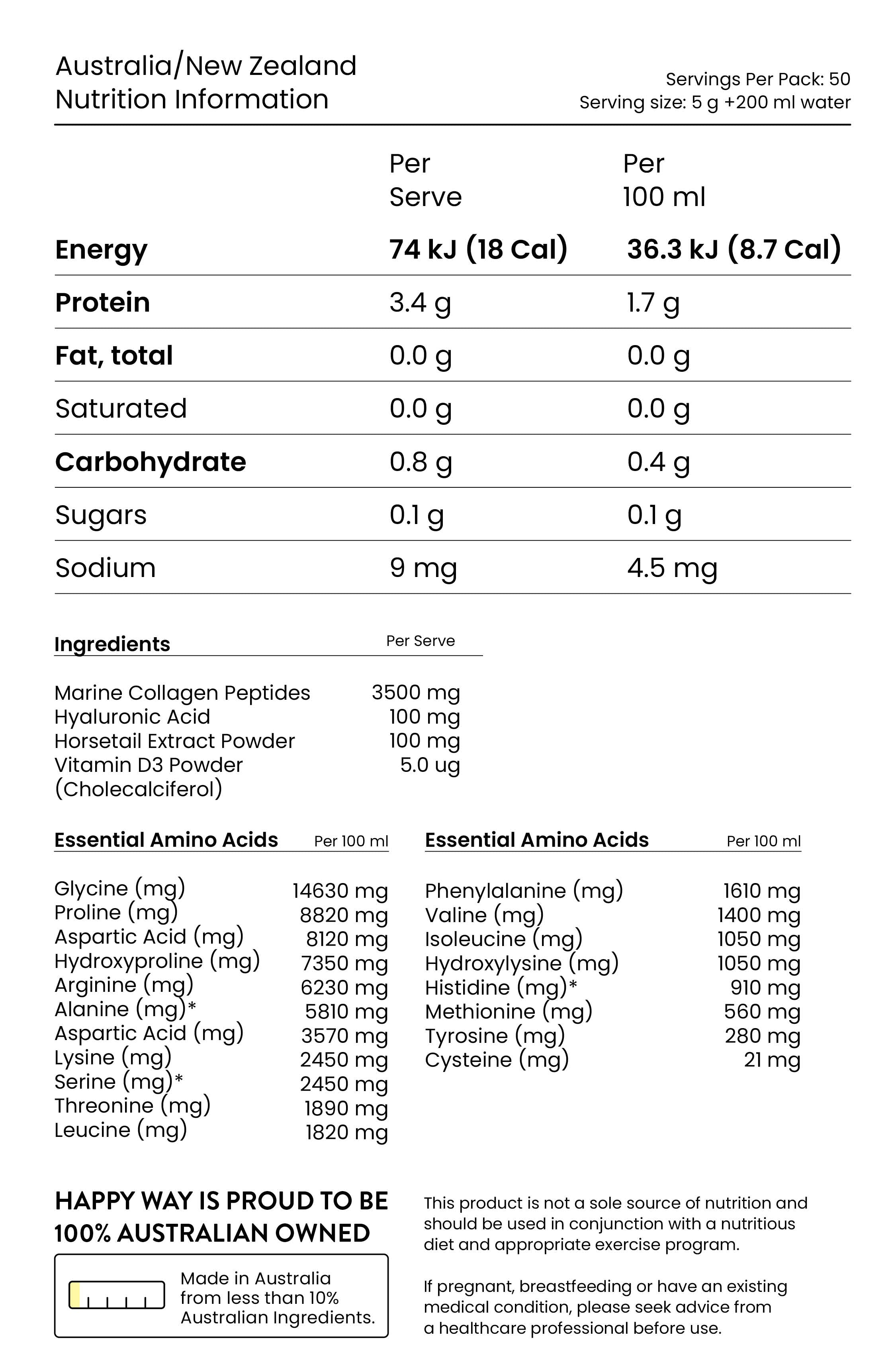 Marine collagen peptides (Fish) (70%), Natural Flavour, Inulin, Citric Acid, Bromelain Powder derived from pineapple, Australian mixed berry juice powder (Raspberry, strawberry, pomegranate, elderberry, blackcurrant, blueberry, cranberry juice, acai, goji), Hyaluronic Acid, Natural sweetener: Steviol glycosides, Thaumatin, Horsetail Extract Powder, Vitamin D3 Powder (Cholecalciferol) GLUTEN-FREE.