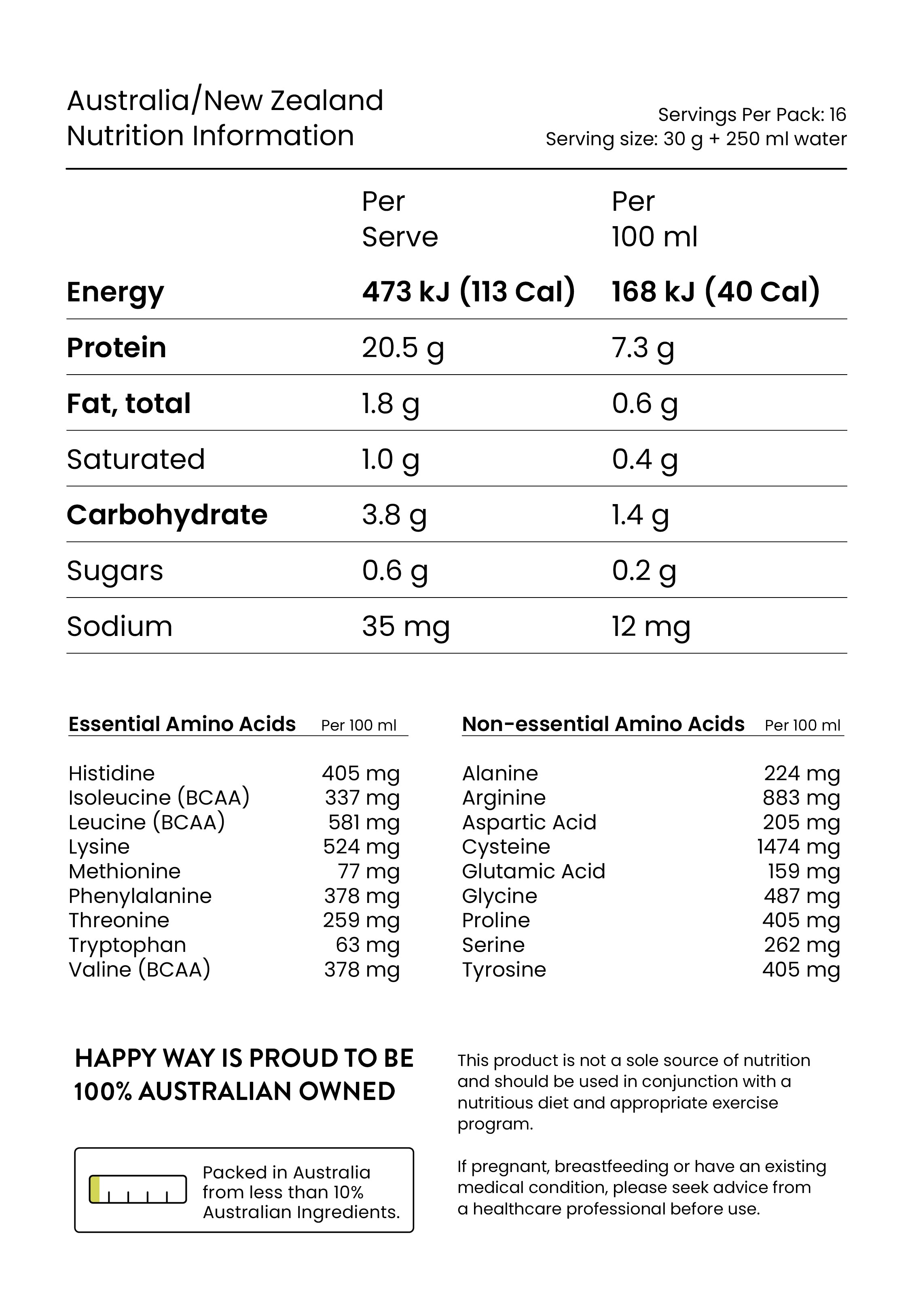 Amino Acid Blend [75% Alanine, Glycine, Valine, Leucine, Isoleucine, Proline, Phenylalanine, Tyrosine, Seine, Threonine, Methionine, Arginine, Histidine, Lysine, Aspartic Acid, Glutamate, Tryptophan, Cysteine], Natural Flavours, Chicory Root Fiber, Acacia Gum Fiber, Food Acids [Citric Acid, Malic Acid, Tartaric Acid], Coconut Water Powder, GO MCT (Medium Chain Triglycerides), Hydrolised Pea Protein, Electrolyte Blend 1.8% [Potassium Citrate, Magnesium Citrate, Sodium Chloride, Calcium Citrate], Vitamin C, Natural chlorophyll, Apple Cider Vinegar Powder, Sweetener (Stevia & Thaumatin).