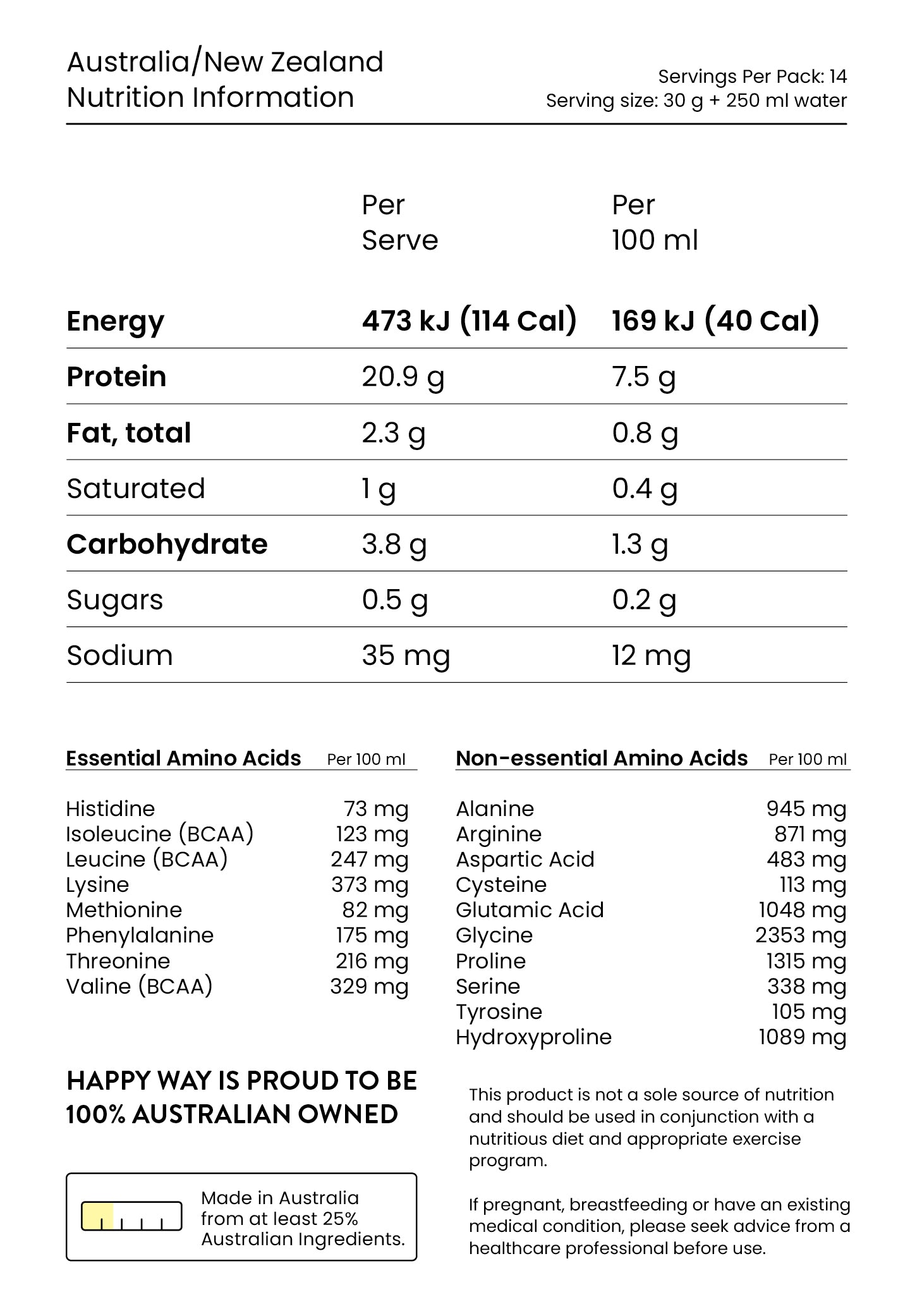 Protein Water Blend [78% Hydrolysed Bovine Collagen, Whey Protein Concentrate (milk)], Chicory Root Fibre, Natural Flavours, Coconut Water Powder, GO MCT (Medium Chain Triglycerides), Electrolyte Blend 1.8% [Potassium Citrate, Magnesium Citrate, Sodium Chloride, Calcium Citrate], Vitamin C, Food Acids (Citric Acid), Sweetener (Stevia & Thaumatin), Beta Carotene, Riboflavin CONTAINS: Milk.
