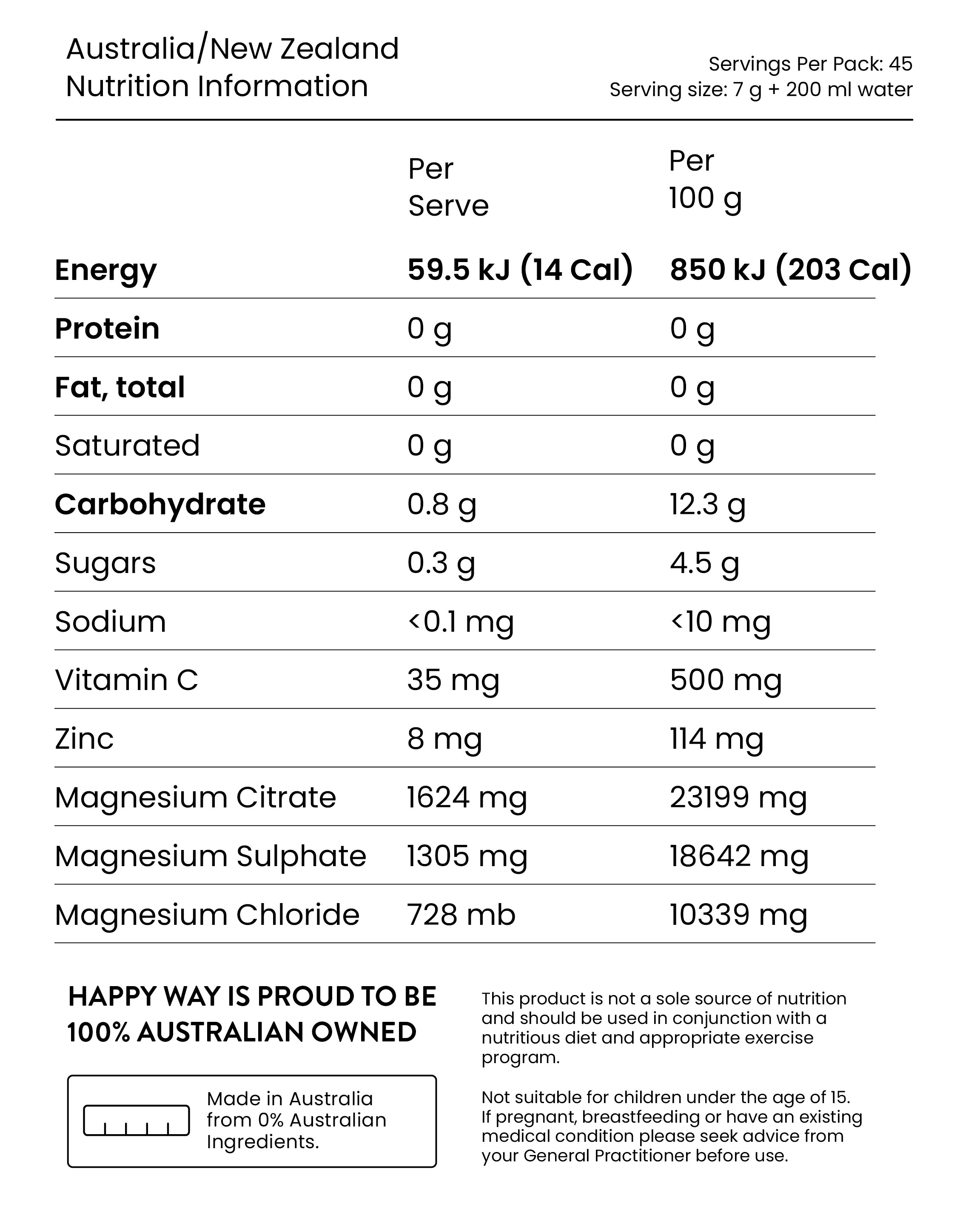 Magnesium Blend (Magnesium Citrate, Magnesium Sulphate, Magnesium Chloride) Inulin, Natural Flavour, Citric Acid, Ascorbic Acid (Vitamin C) Beta Carotene, Stevia, Thaumatin, Zinc. GLUTEN-FREE. VEGAN-FRIENDLY.