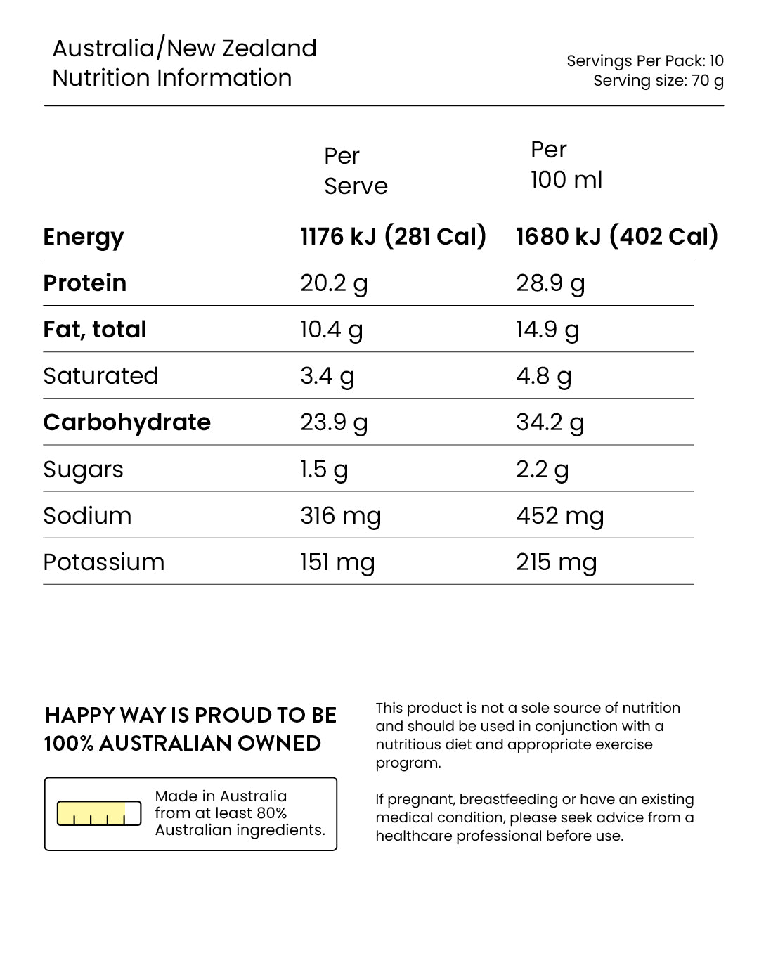 Australian Quick Oats (55%), Plant Protein Blend (Pea Protein Isolate, Rice Protein), Natural Flavour, MCT Powder derived from Coconut, Maca Powder, Chia Seeds, Psyllium Husk, Natural Sweetener (Steviol Glycoside & Thaumatin), Himalayan Rock Salt.