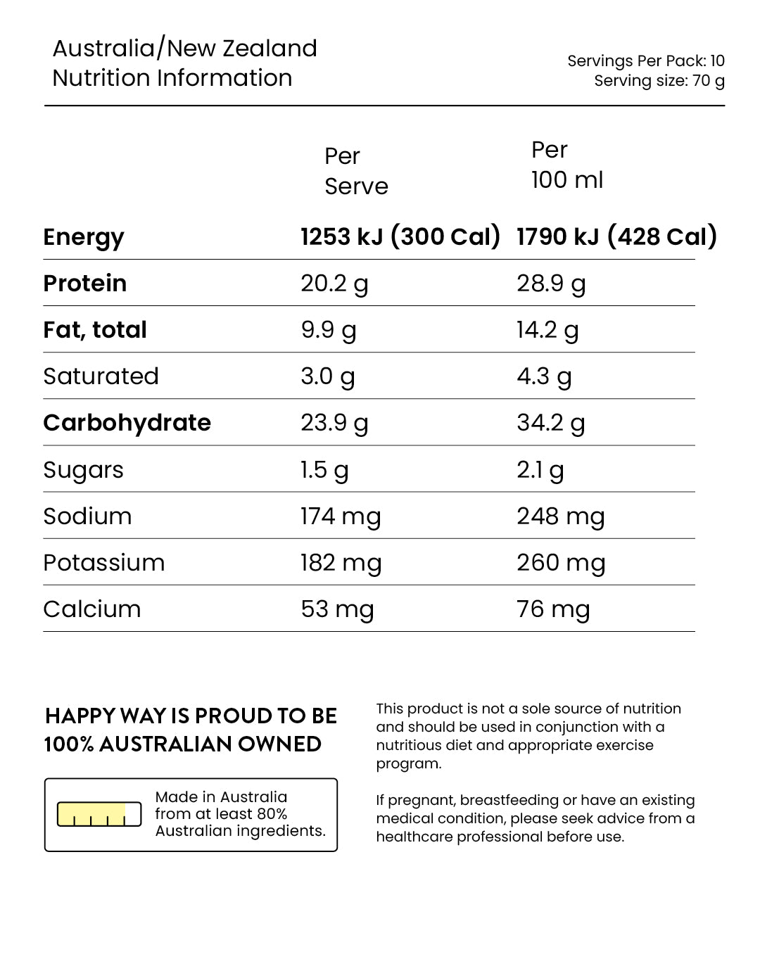 Australian Quick Oats (55%), Whey Protein Concentrate (Milk), Skim Milk Powder, Natural Flavour, MCT Powder derived from Coconut, Maca Powder, Chia Seeds, Psyllium Husk, Natural Sweetener (Steviol Glycoside & Thaumatin) Himalayan Rock Salt.