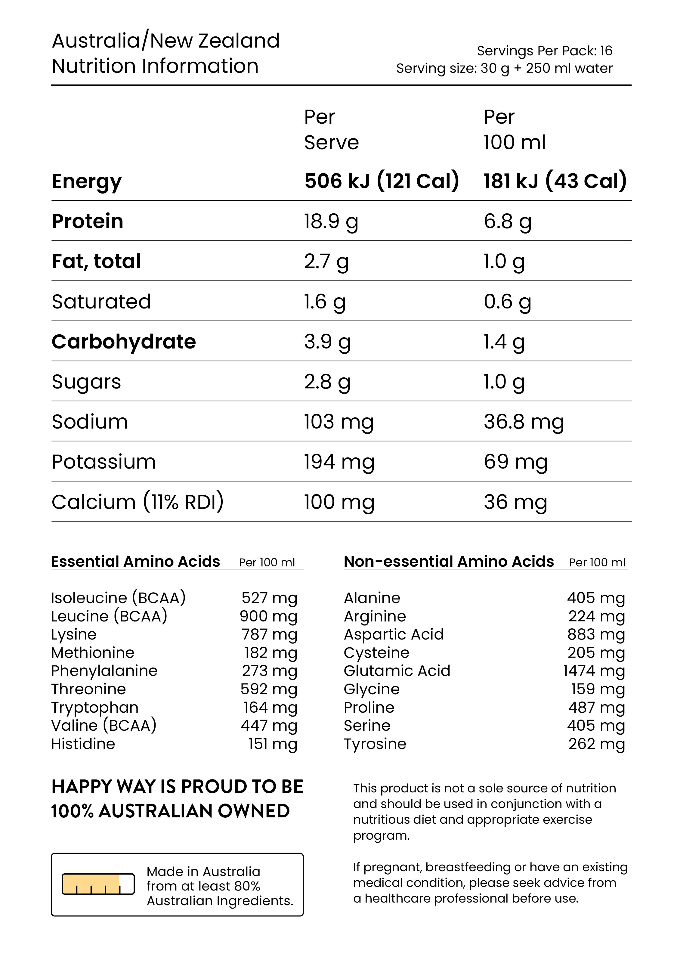 Combine two heaped tablespoons (30 g) with water or your milk of choice, mixing well in a shaker or blender to create a delicious shake or smoothie. Alternatively, add 30 grams to your morning oats, natural yoghurt or baked goodies. For optimal results, enjoy twice a day.
