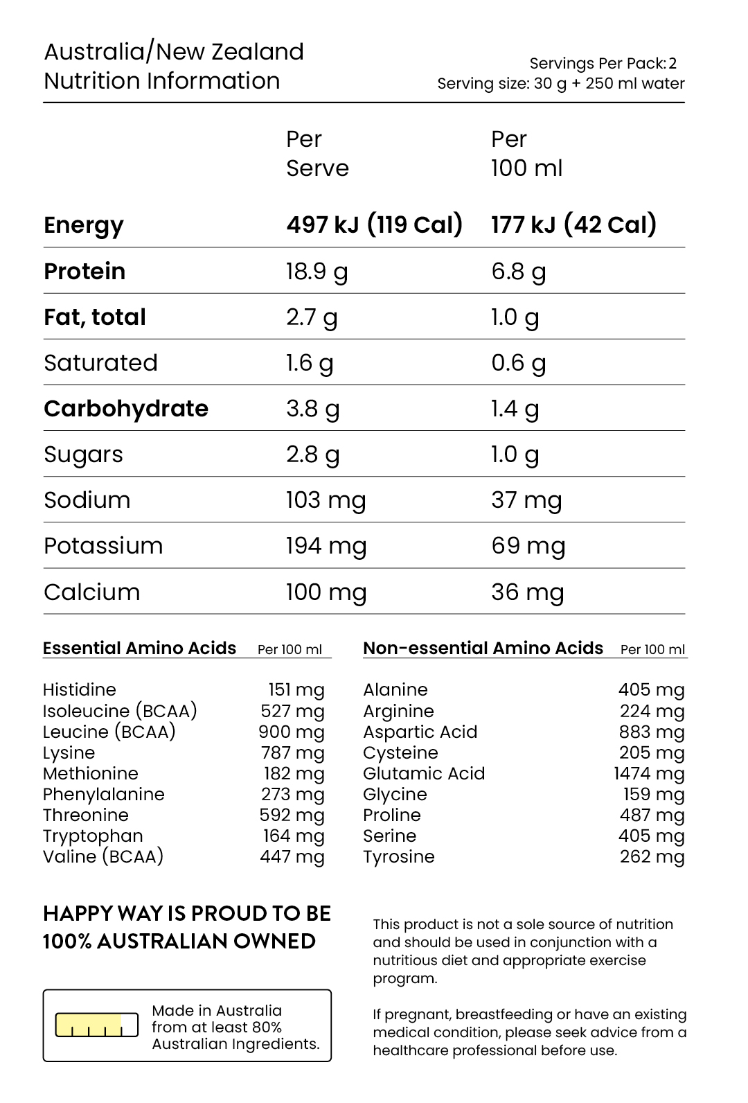 Combine two heaped tablespoons (30g) with water or your milk of choice, mixing well in a shaker or blender to create a delicious shake or smoothie. Alternatively, add 30 grams to your morning oats, natural yoghurt or baked goodies. For optimal results, enjoy twice a day.